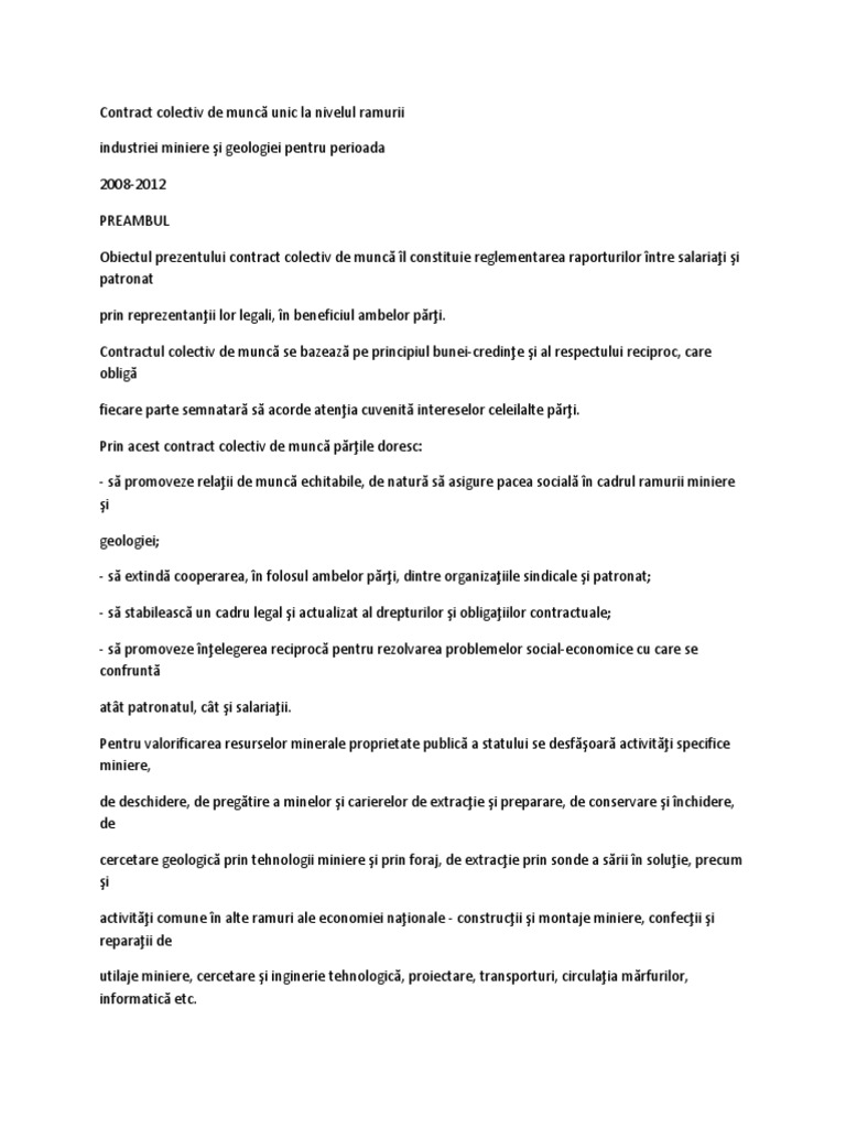 Prin incheierea prezentului contract colectiv de munca, partile semnatare isi manifesta si disponibilitatea pentru promovarea unor relatii de munca echitabile, de natura sa asigure protectia sociala a salariatilor, prevenirea sau limitarea conflictelor colective de munca ori evitarea declansarii. Model contractul colectiv de muncă descarcă aici. Contract colectiv de muncă încheiată între conducerea. Contractul colectiv de munca nu contine art. Locul de muncă al salariatului poate fi schimbat temporar de către angajator prin deplasarea în.
