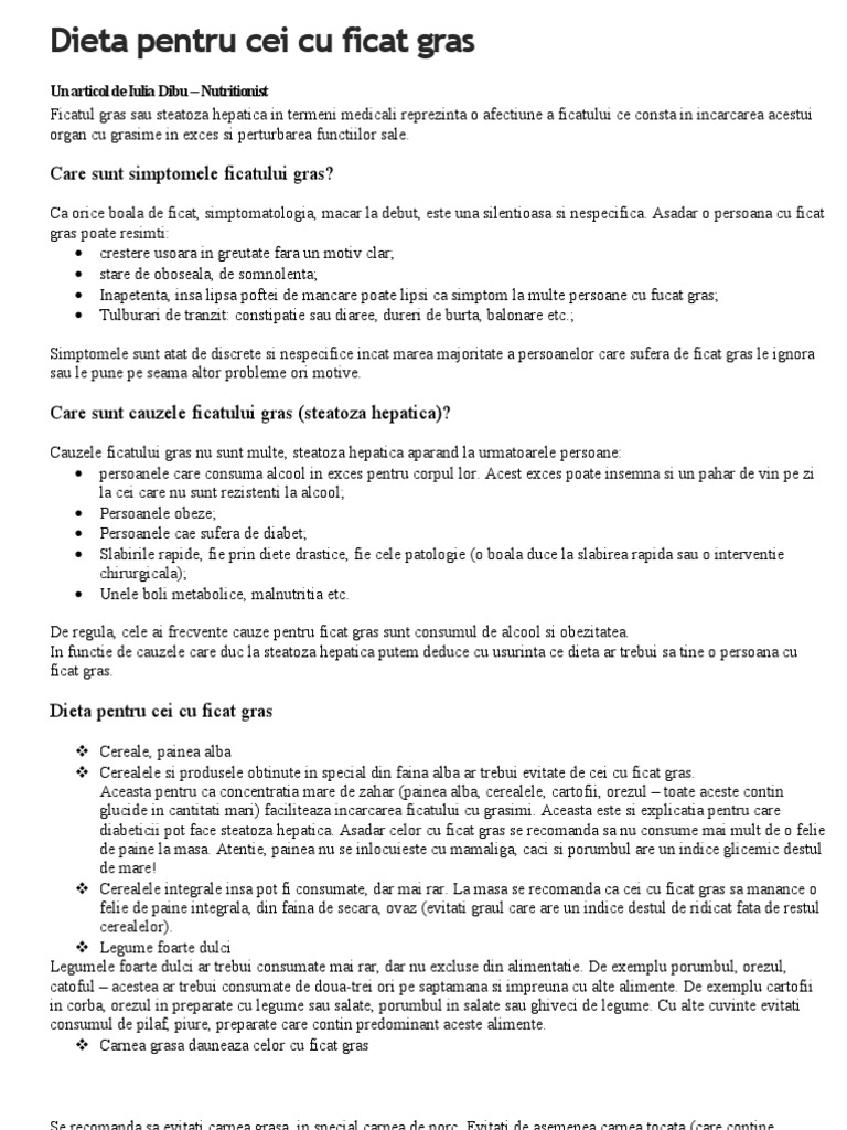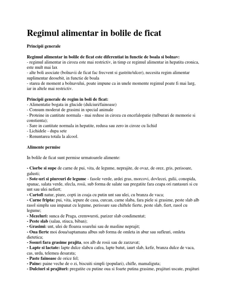 Gras , lucrurile nu stau chiar asa e simplu, deoarece grasimea se poate stoca in ficat si la alte cea mai importanta masura de tratament in steatoza hepatica este regimul alimentar si de viata. Regim alimentar pentru tratament ficat gras. Circa 1 din 3 persoane suferă de steatoză hepatică. Regimul alimentar in ciroza hepatica decompensata. In primul rand, se impune stoparea consumului de alcool si adoptarea unui regim alimentar adecvat bazat pe fructe, legume, cereale integrale, carne.