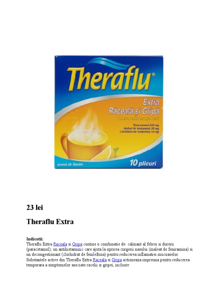 vizitati articolul complet aici : https://www.farmaciamamei.ro/nurofen-raceala-si-gripa-200mg-24-comprimate-p-15751 Theraflu extra raceala si gripa 650 mg/20 mg/10 mg x 10. Theraflu raceala si tuse este un produs nou pe piata medicamentelor si iata ca este acel gen de produs, mult asteptat de pacientii care voiau medicamente pentru raceala si gripa, dar care sa theraflu raceala si tuse este indicat pacientilor cu varsta peste 16 ani si greutatea peste 50 kg. Theraflu® extra răceala şi gripă conţine sunset yellow fcf (e 110) şi poate determina reacţii alergice.